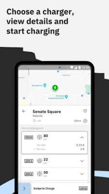 In the app you can: • Charge at home, work and on the move. Just plug in your car - we’ll do the rest. • View a real-time map of the state of charging points (Available – Charging – Out of order) • Navigate to the location • Start and stop charging • Monitor charging power remotely