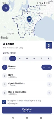 You can purchase tickets by entering your place of departure and arrival, either in the form of a stop, address, or place. You can also pick the zones you wish to travel from and to on the map. The 2-8 zones fast purchase is relevant for you, if you know how many zones you need from where you are. You can use that feature, if you give the app your permission to localization (GPS) so that the app can determine your start zone. Giving your permission to localization, which is voluntary, can also help you determine your location on the map versus your ticket’s validity area.