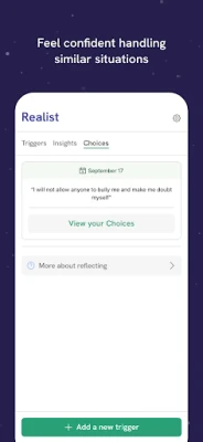 The Realist helps you identify and reflect on the moments when you are not at your best — perhaps when you've been tense, frustrated, upset or stressed. Through guided reflection, the Realist enables you to balance your mind, understand what has contributed to making you feel that way, and make more sustainable choices for dealing with each situation.