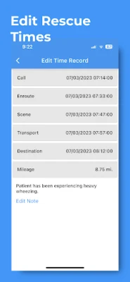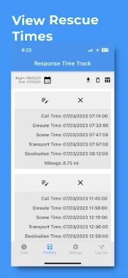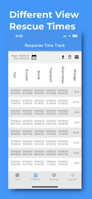The Response Time Track App enables emergency first responders, including EMTs, paramedics, and other EMS professionals, to efficiently record response times for call, enroute, scene, transport, and destination stages with just a tap of a button. Users can log additional details such as mileage traveled, notes, and customizable truck information to streamline reporting. EMS teams can review the history of rescue operations for accurate bookkeeping and edit records as needed. The app also allows users to download or share these records in CSV format, simplifying and enhancing data management.