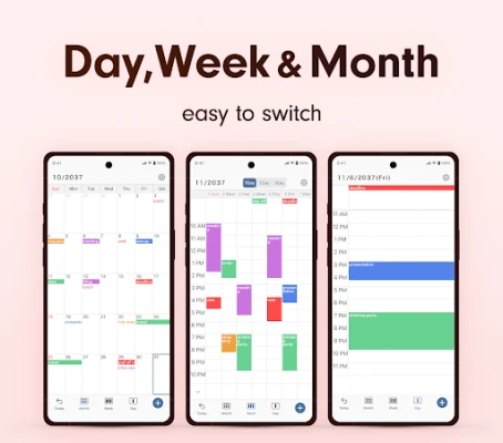 Plan for whatever time period you want. Choose a comfortable display mode - e.g. a day planner to see only what’s on agenda today or a weekly calendar to get prepared for a few days in advance.