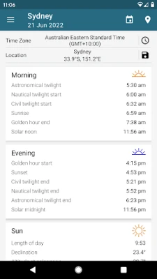 The app has a map view which plots the daily sun and moon path relative to your current location. It also contains a widget for your home screen showing sunrise/set times for the current day and your current location.